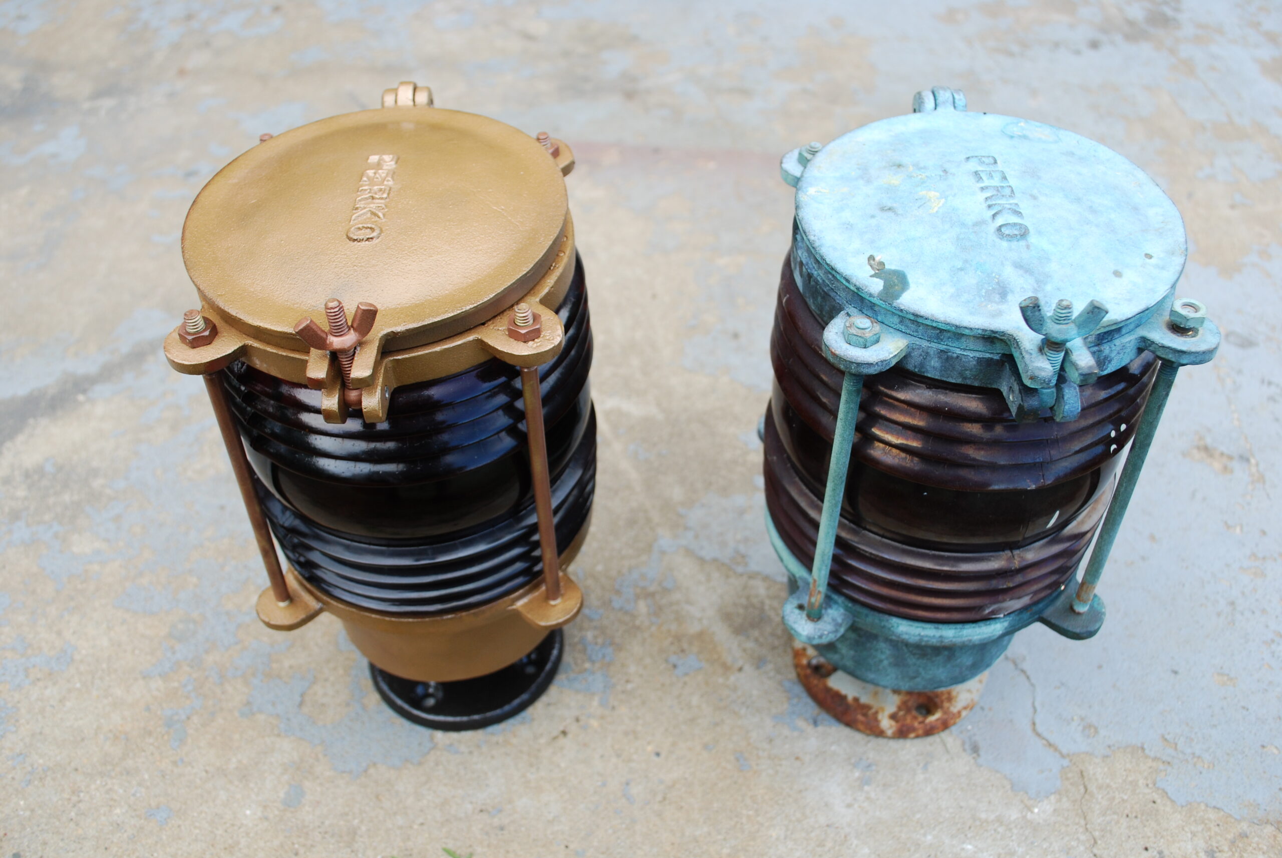 Here are some before and after photo’s of the USS Biloxi lights we restored for the City of Biloxi. These are some of the original